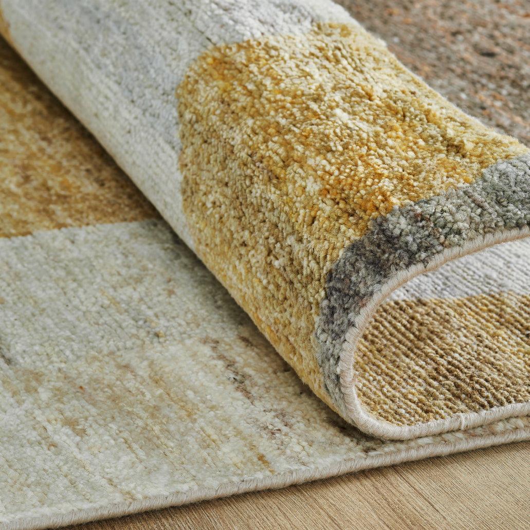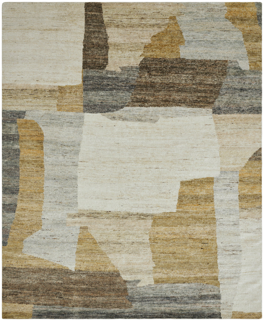 Modern linear designs and bold curves tell a story of artful simplicity in this cutting-edge area rug collection. Meticulously hand knotted of 100% premium hand-spun wool yarns.