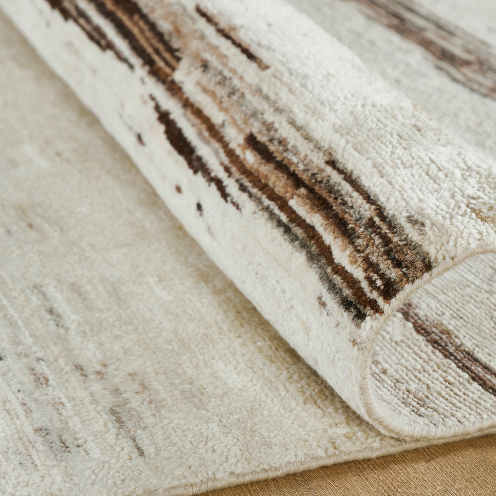 Modern linear designs and bold curves tell a story of artful simplicity in this cutting-edge area rug collection. Meticulously hand knotted of 100% premium hand-spun wool yarns.